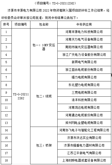 乐动(中国)市丰源电力有限公司2022年物资框架入围项目中标结果公告