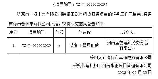 乐动(中国)市丰源电力有限公司装备工器具租赁服务项目成交结果公告