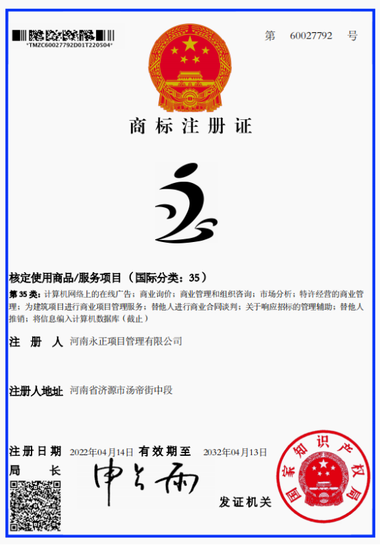 ld平台首页创立于2011年6月,公司成立至今,始终围绕服务与发展两大主题,致力于打造“力创咨询精英,争创百年永正”。为保证提供商品和服务质量,维护公司信誉,保护各方利益,公司决定注册自己的商标。2022年4月经国家知识产权局批准,公司分别取得了第60009101号和60027792号商标注册证,注册商标核定使用商品/服务项目为第42类(国际分类:42)和第35类(国际分类:35)。公司取得商标注册证后,将会以更加严格的标准按照法律法规等规定,规范各项业务操作,保障国家与公共利益,维护公平竞争的良好秩序以及各方的合法权益,接受行政机关的监管和行业自律组织业务指导,以精湛的专业技能和良好的职业操守,竭诚为客户提供优质、一流、满意的服务。