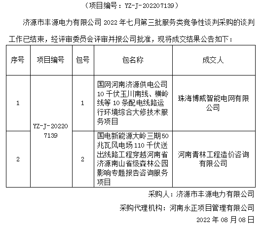 乐动(中国)市丰源电力有限公司2022年七月第三批服务类竞争性谈判采购成交结果公告