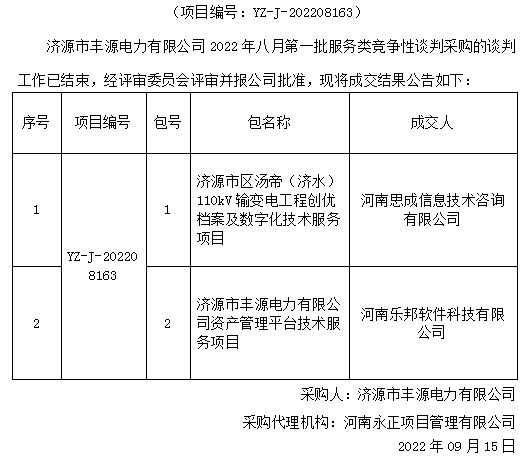 乐动(中国)市丰源电力有限公司2022年八月第一批服务类竞争性谈判采购成交结果公告