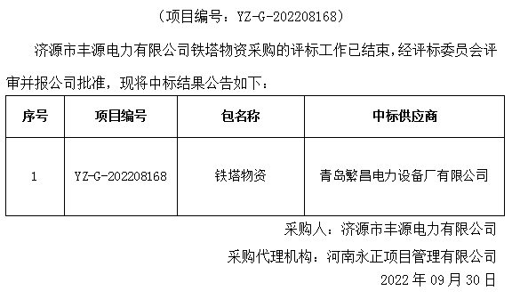 乐动(中国)市丰源电力有限公司铁塔物资采购中标结果公告