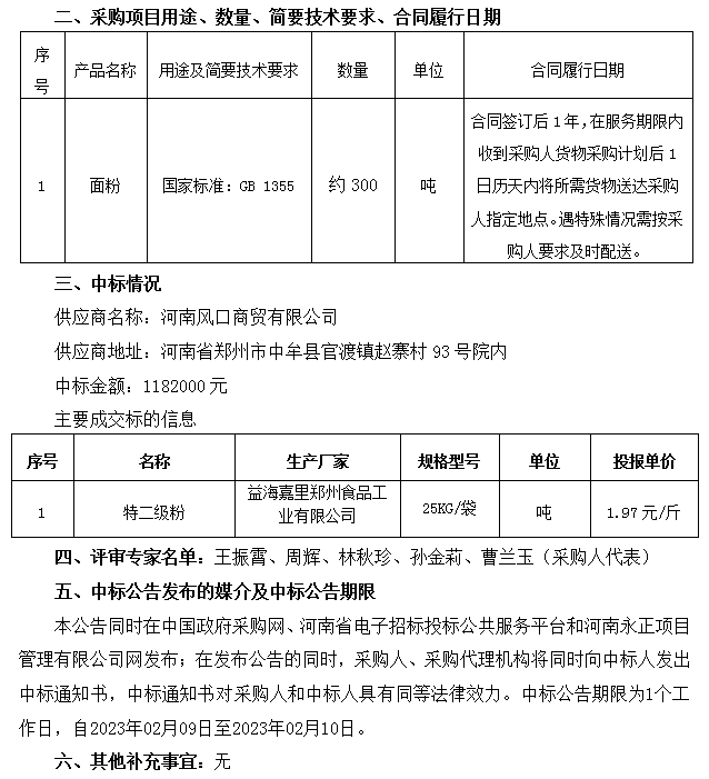 河南省内黄监狱2022年-2023年度监狱大宗物资及供应站食品采购项目(包二:面粉)第二次中标结果公告