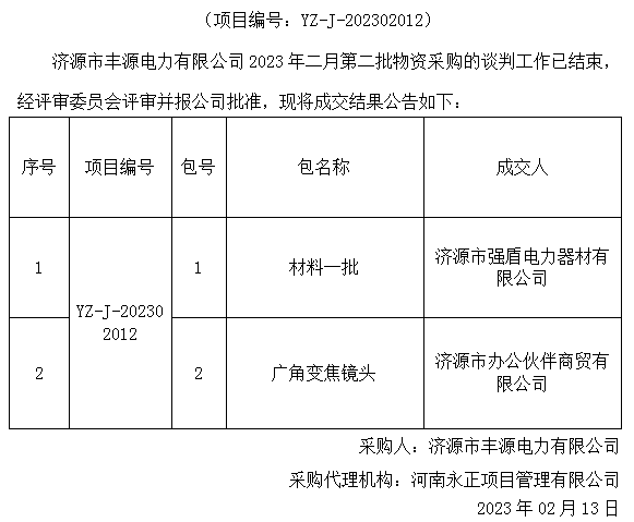 乐动(中国)市丰源电力有限公司2023年二月第一批物资采购成交结果公告