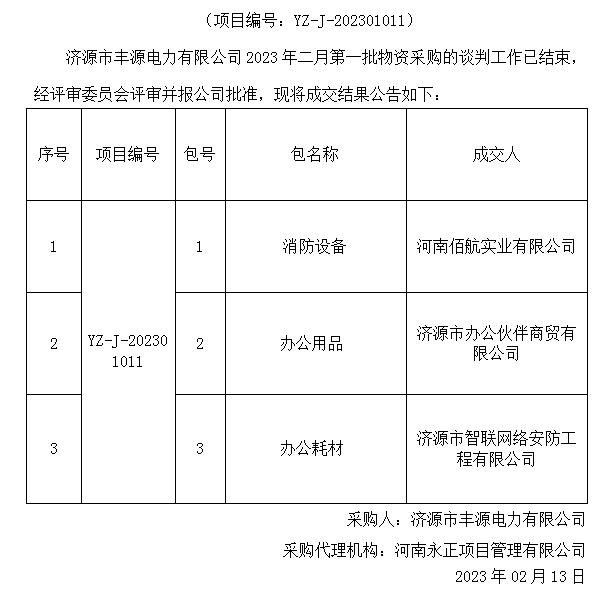 乐动(中国)市丰源电力有限公司2023年二月第一批物资采购成交结果公告