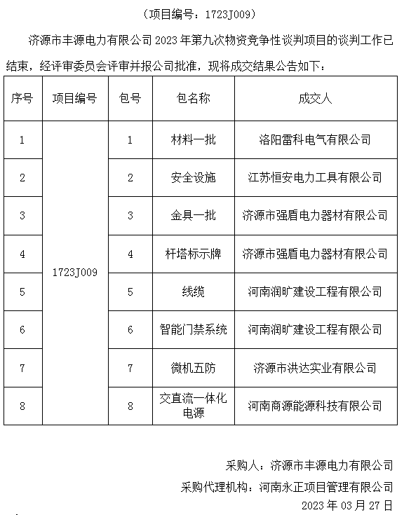 乐动(中国)市丰源电力有限公司2023年第九次物资竞争性谈判项目成交结果公告