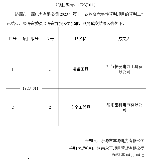 乐动(中国)市丰源电力有限公司2023年第十一次物资竞争性谈判项目成交结果公告