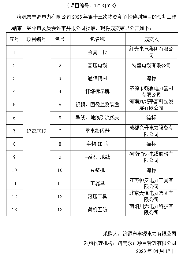 乐动(中国)市丰源电力有限公司2023年第十三次物资竞争性谈判项目成交结果公告
