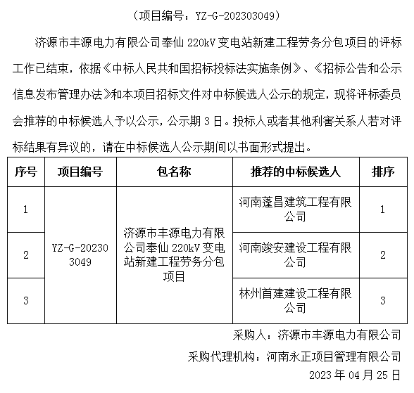 乐动(中国)市丰源电力有限公司奉仙220kV变电站新建工程劳务分包项目中标候选人公示