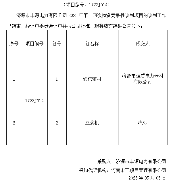 乐动(中国)市丰源电力有限公司2023年第十四次物资竞争性谈判项目成交结果公告