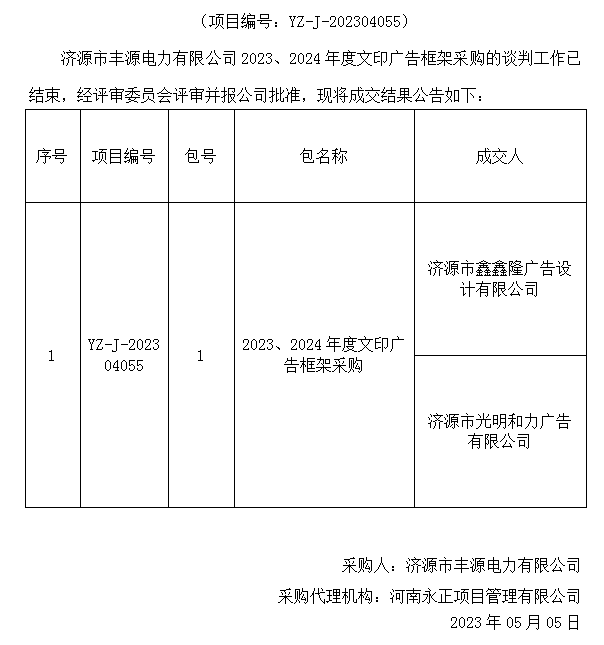 乐动(中国)市丰源电力有限公司2023、2024年度文印广告框架采购成交结果公告