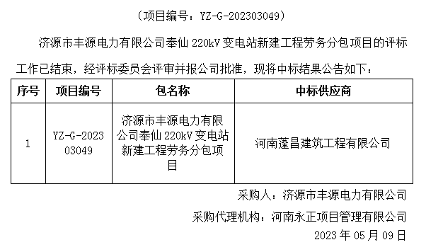 乐动(中国)市丰源电力有限公司奉仙220kV变电站新建工程劳务分包项目中标结果公告