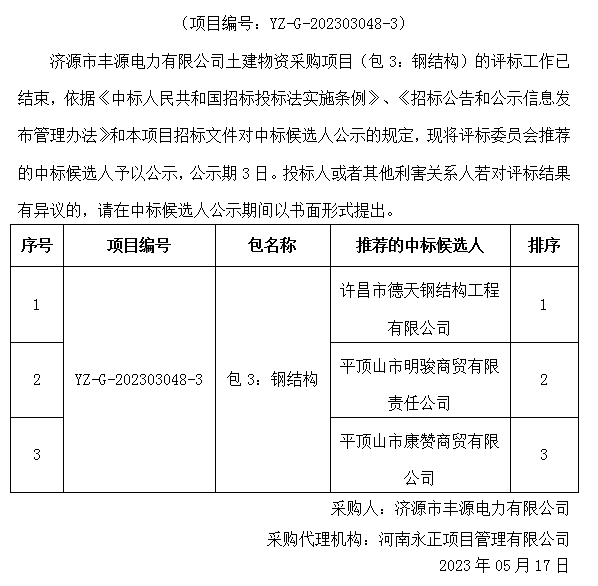 乐动(中国)市丰源电力有限公司土建物资采购项目(包3:钢结构)中标候选人公示