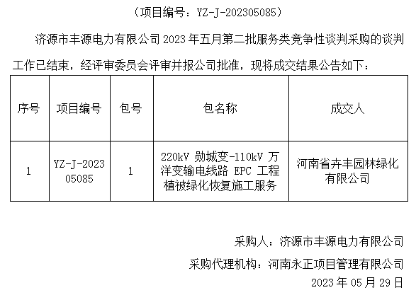 乐动(中国)市丰源电力有限公司2023年五月第二批服务类竞争性谈判采购成交结果公告