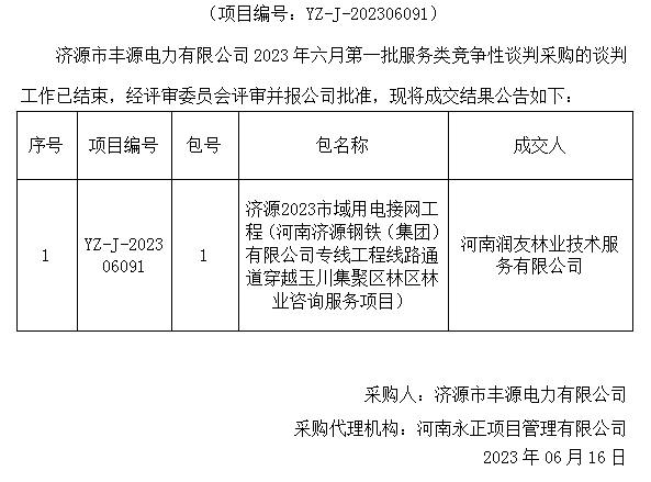 乐动(中国)市丰源电力有限公司2023年六月第一批服务类竞争性谈判采购成交结果公告