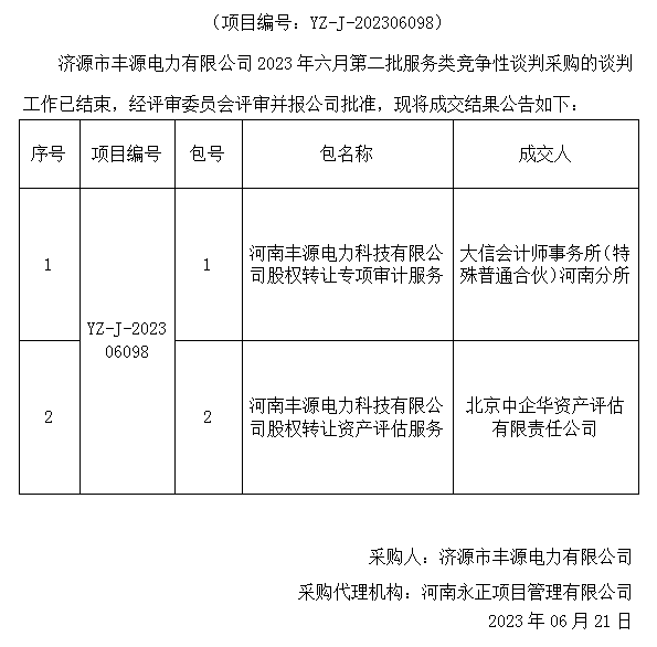 乐动(中国)市丰源电力有限公司2023年六月第二批服务类竞争性谈判采购成交结果公告