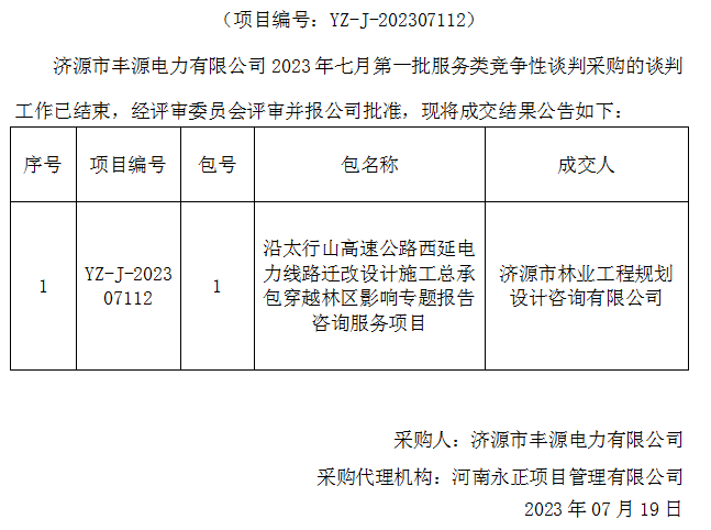 乐动(中国)市丰源电力有限公司2023年七月第一批服务类竞争性谈判采购成交结果公告